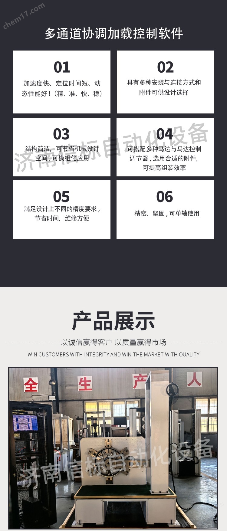 轮毂扭转疲劳试验机 车轮扭转扭矩扭断测试系统管理软件:该软件是整个全数字伺服控制器工作的基础,其主要功能是管理控制系统的硬件资源、定义传感器、数字控制参数调整、设置保护,显示当前控制模式、液压和函数发生器状态以及传感器标定,并且提供双踪数字示波器、数字伺服阀电流表和6块数字电压表用于试验数据实时显示。函数发生器软件:该软件主要用于恒幅动态试验,例如恒幅疲劳试验等。函数发生器软件会自动对控制量(例如载荷)的峰谷值进行跟踪修正,以保正在整个试验过程中,每个峰值的动态误差典型值为±1%FS,试验时操作人员可以动态地改变峰值、谷值和频率,也能进行人工或自动信号保持,如果自动信号保持循环数间隔被设置,则试验循环数每增加一个循环数间隔,软件就会自动把信号保持在设定的水平上,以方便于某些试验数据的测量(如目测裂纹长度)。软件可选的波形有正弦波、三角波、、斜波、锯齿波、组合波、组合斜波试验。试验结束,软件会将一些重要的数据存盘,例如试验载荷、频率、循环数和试验时间等。该软件也可进行简单的静态试验。多功能试验软件:该软件是一个柔性强,功能全的试验软件,用户可以用其设计特殊的试验方法,却不需要编程。此软件将伺服控制器具备的各种控制功能、数据采集功能和其他的一些辅助功能都以图标的方式做在了一个面板上,用户可以将这些功能图标用鼠标拖放到试验定义面板中,并将其按照用户需求随意组合起来,就可以按照用户自定义的试验方法进行试验。该软件可用于随机谱试验