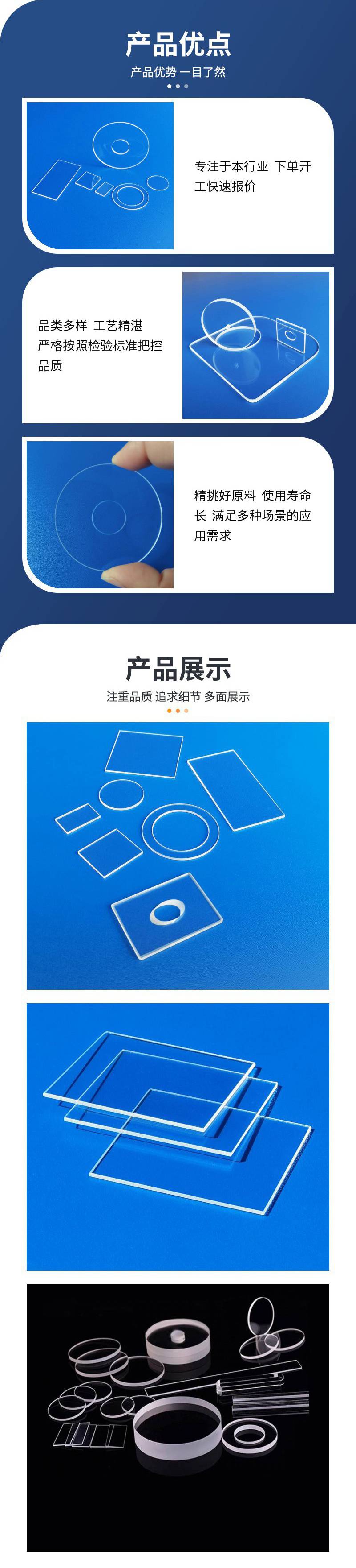 它是用高纯度氢氧熔化的光学石英玻璃,所以含有大量的羟基(2000ppm),具有优良的透紫外性能,特别是在短波紫外区,其透过性能远远地胜过所有其他玻璃,在185μm处的透过率可达90%,合成石英玻璃在2730nm处具有很强的吸收峰,无颗粒结构。是185—2500mμ波段范围内的优良光学材料。