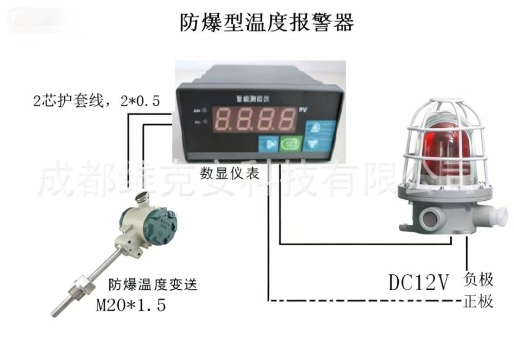 本产品由防爆温度传感器和四位数显式温度报警器组成。