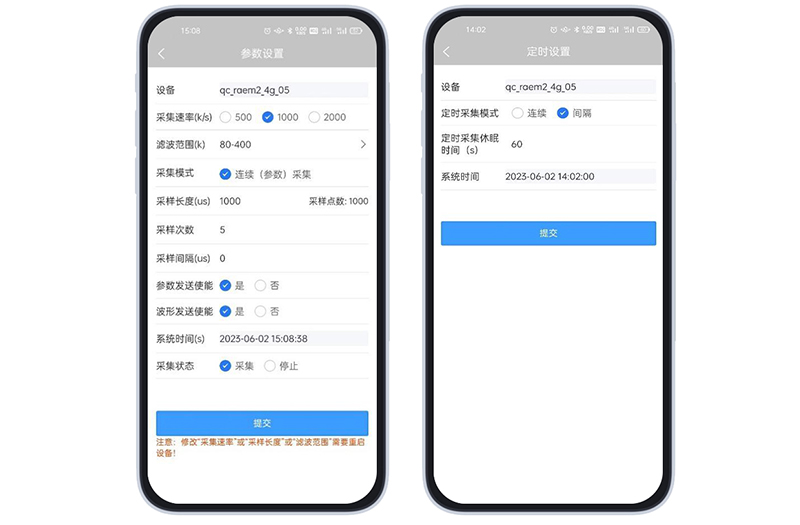 时间触发信号采集,适合连续各种声发射信号采集。有连续采集和间隔采集两种模式可选。间隔采集模式下工作最长工作318天,连续采集模式下可工作14h。设置好定时休眠时间后,设备自动进入休眠,休眠完成后自动开启采集。