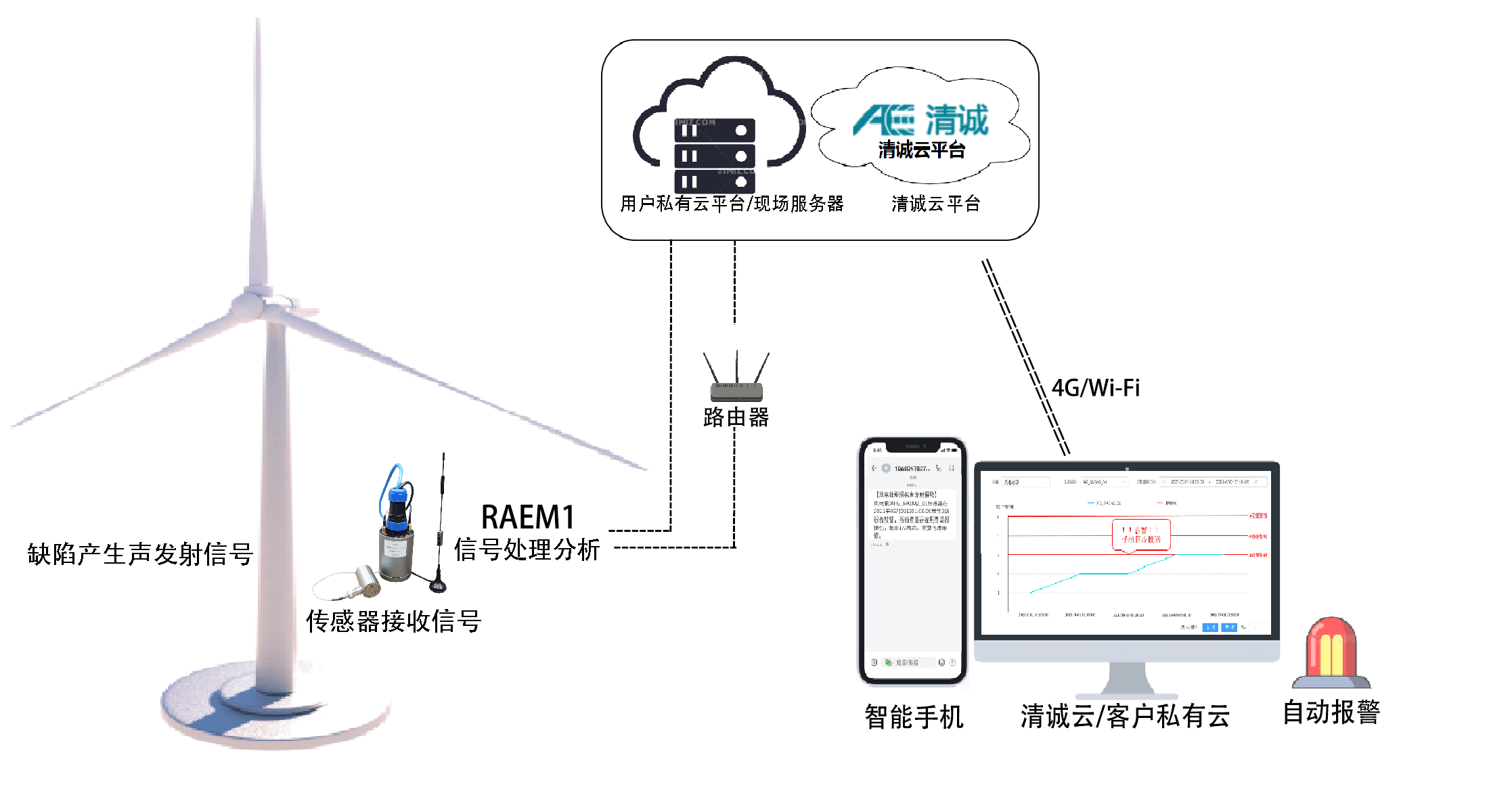 原理:风电设备在发生裂纹、断裂等损伤过程中释放瞬态弹性波,系统接收分析这个声波,判断风电设备详细情况,评估风电设备的健康状态。