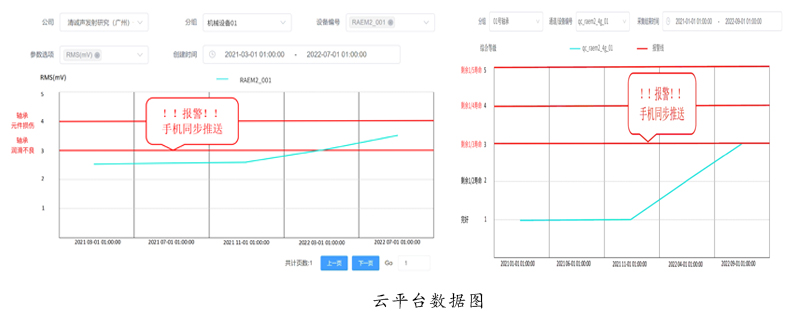 实现了对转动设备的(松动、损伤、润滑等)状态声波(声发射)监测检测,并将报警信息自动推送给用户,方便用户及时开展维修,以延长转动设备寿命,杜绝因损伤累积发展而导致的损失和事故。