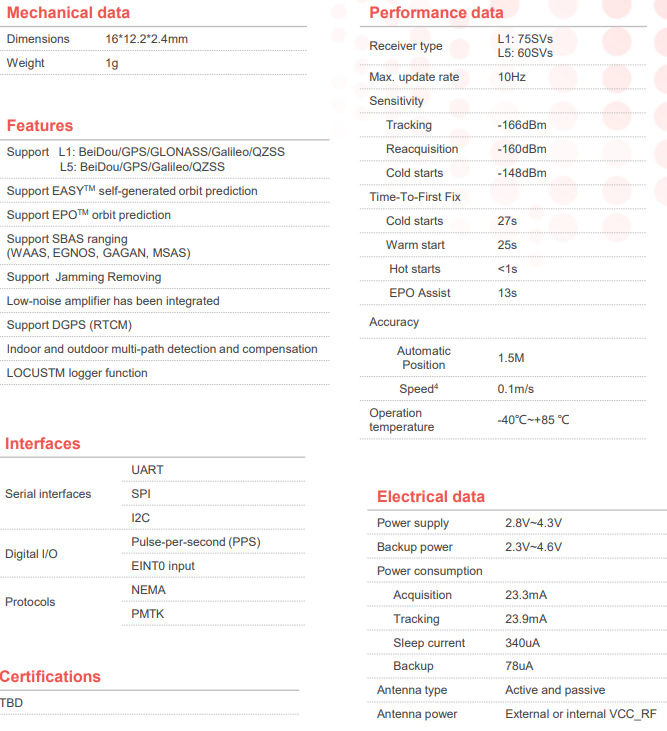 G68D提供同步GPS、GLONASS、 北斗、伽利略和QZSS开放服务L1接收站 能力和GPS,北斗,伽利略和QZSS开放 服务L5接收能力。G68D可以获取和 跟踪多个卫星信号的任意组合。结合 名为EASY的高级AGPS(嵌入式辅助 系统)采用成熟的AlwaysLocate技术, G68D实现了最高的性能并充分 符合工业标准。