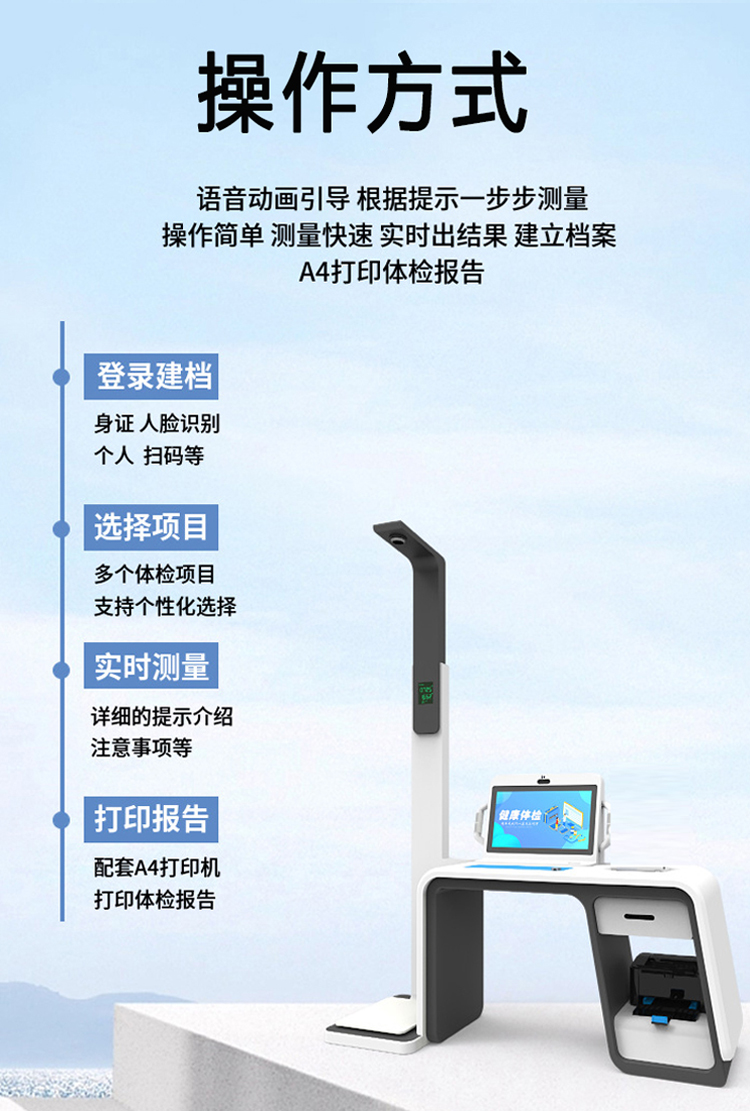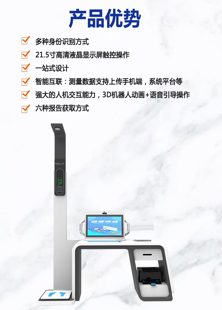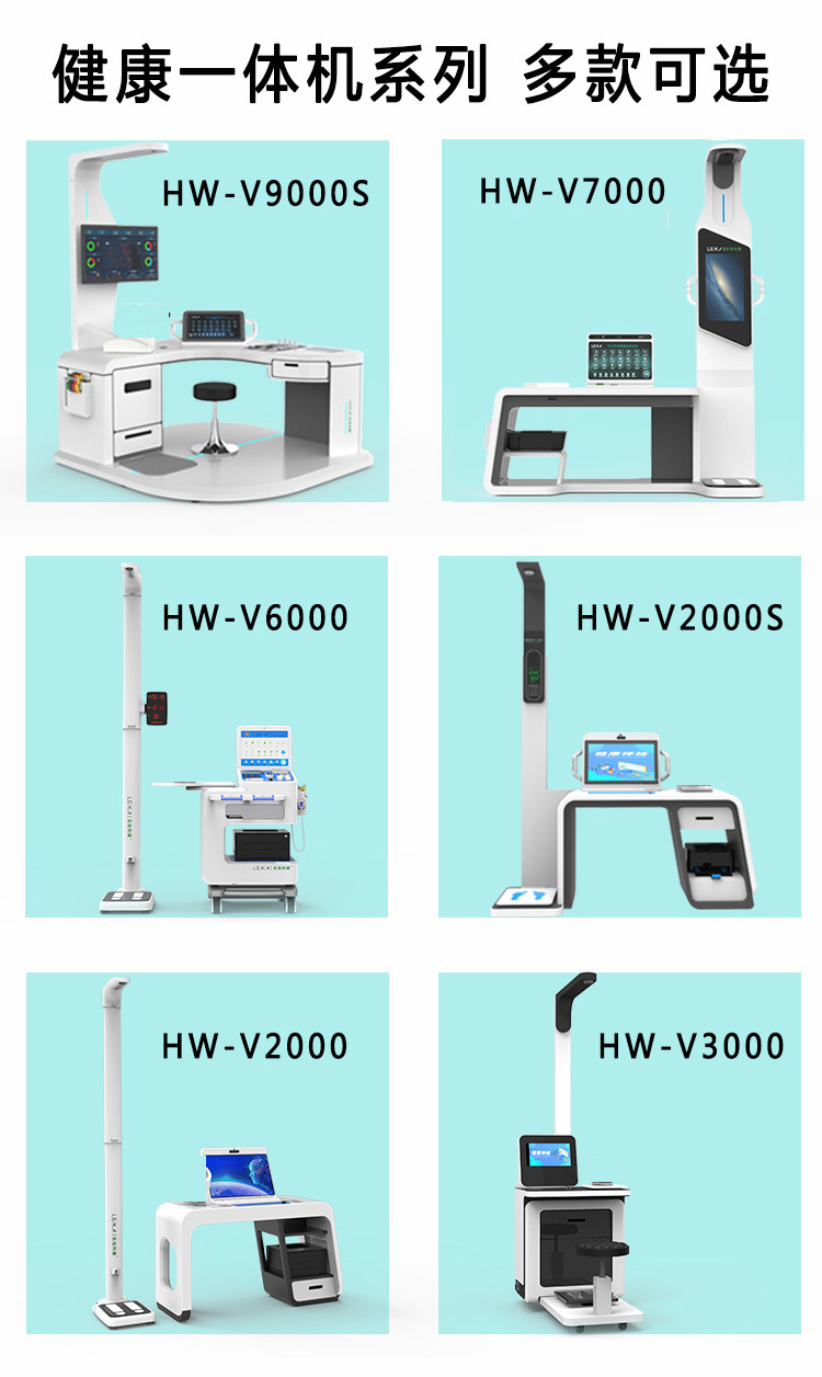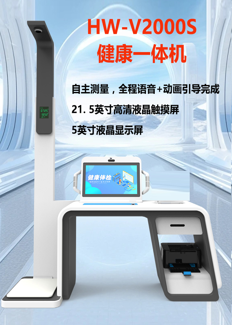 智能互联多参数健康检查一体机HW-V2000S是一款集多项检测功能于一体、智能化程度高、操作便捷的智能体检仪器,适用于基层医疗机构、体检中心、社区、企业等场景,能够提供全面、快速、准确的健康检查服务,并支持数据云存储与健康管理。