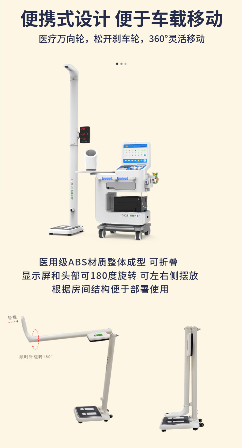 便携式结构:整机ABS工程模具成型,底部四角带刹车轮,移动方便;身高体重模块可折叠,适合外出体检。
