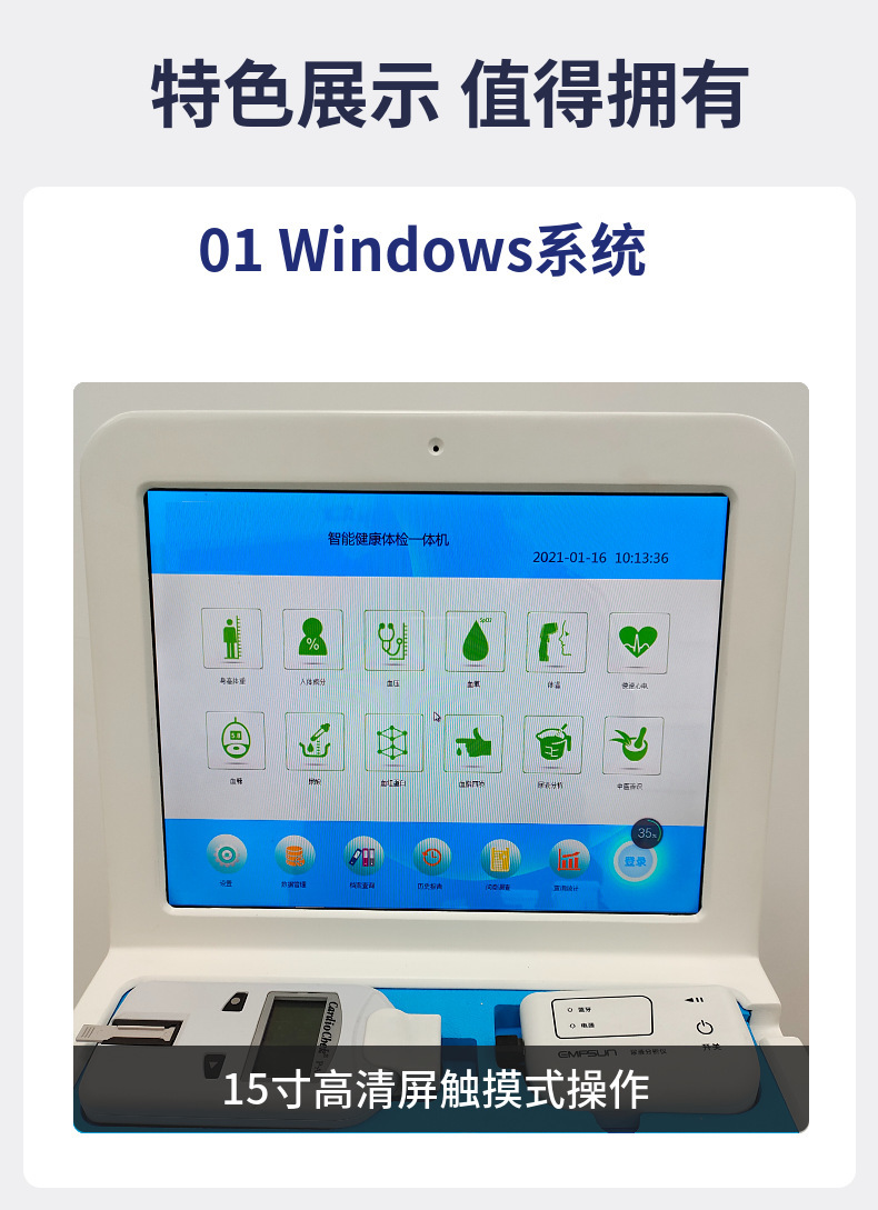 15寸电容触摸屏:支持轮椅高度操作,语音分段引导(如“请站稳,接下来测量血压”),老年人独立操作成功率达95%。