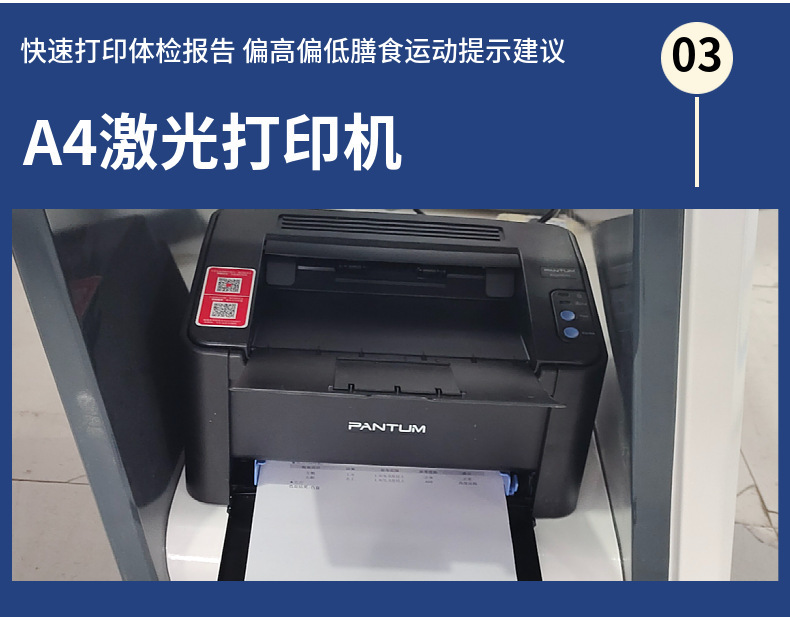 打印功能:内置A4激光打印机,支持体检报告现场打印及健康建议二维码生成。