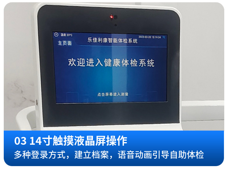 配备14英寸高清液晶触摸屏,操作界面简洁直观,支持语音播报测量结果,老年人亦可轻松使用。