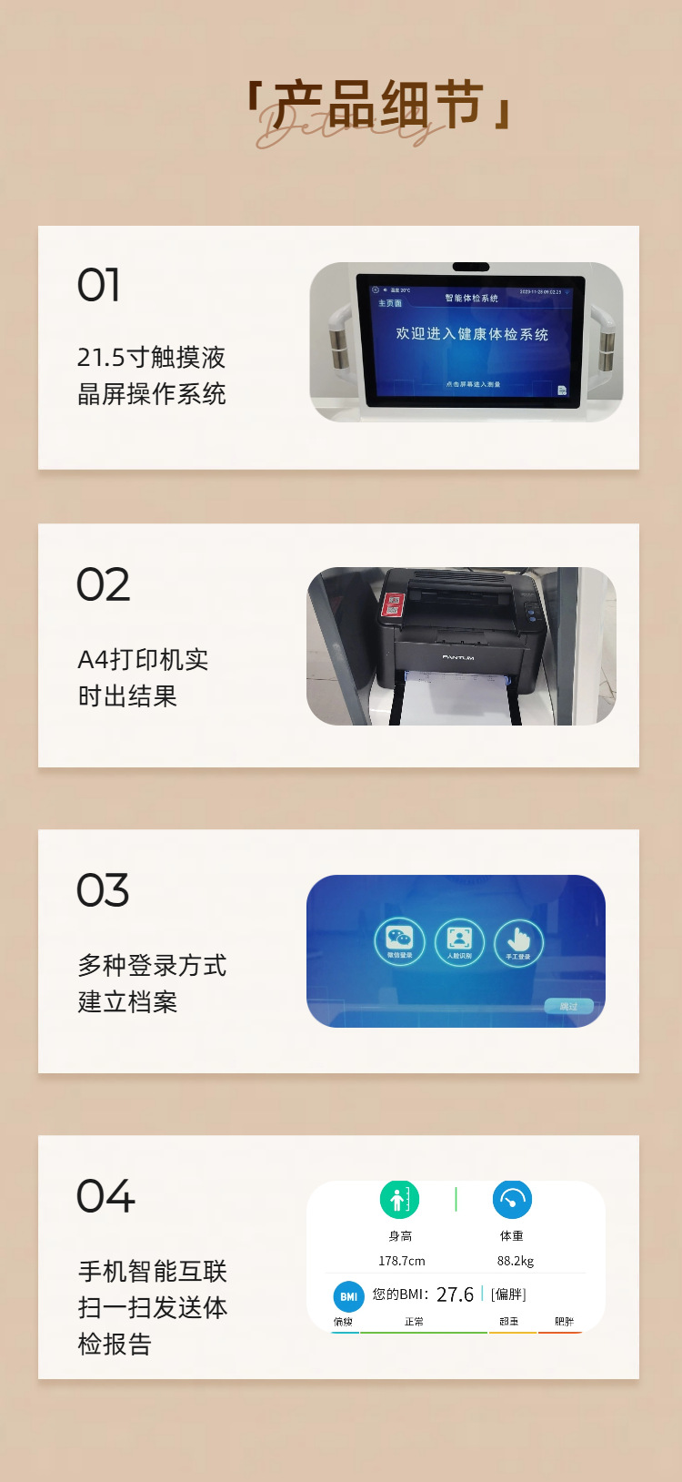 健康管理一体机智能体检工作站HW-V2000S是一款集成多项健康检测功能、操作便捷、适用于多种场景的智能体检设备,具备较高的性价比和市场竞争力。以下是对该设备的详细介绍:
