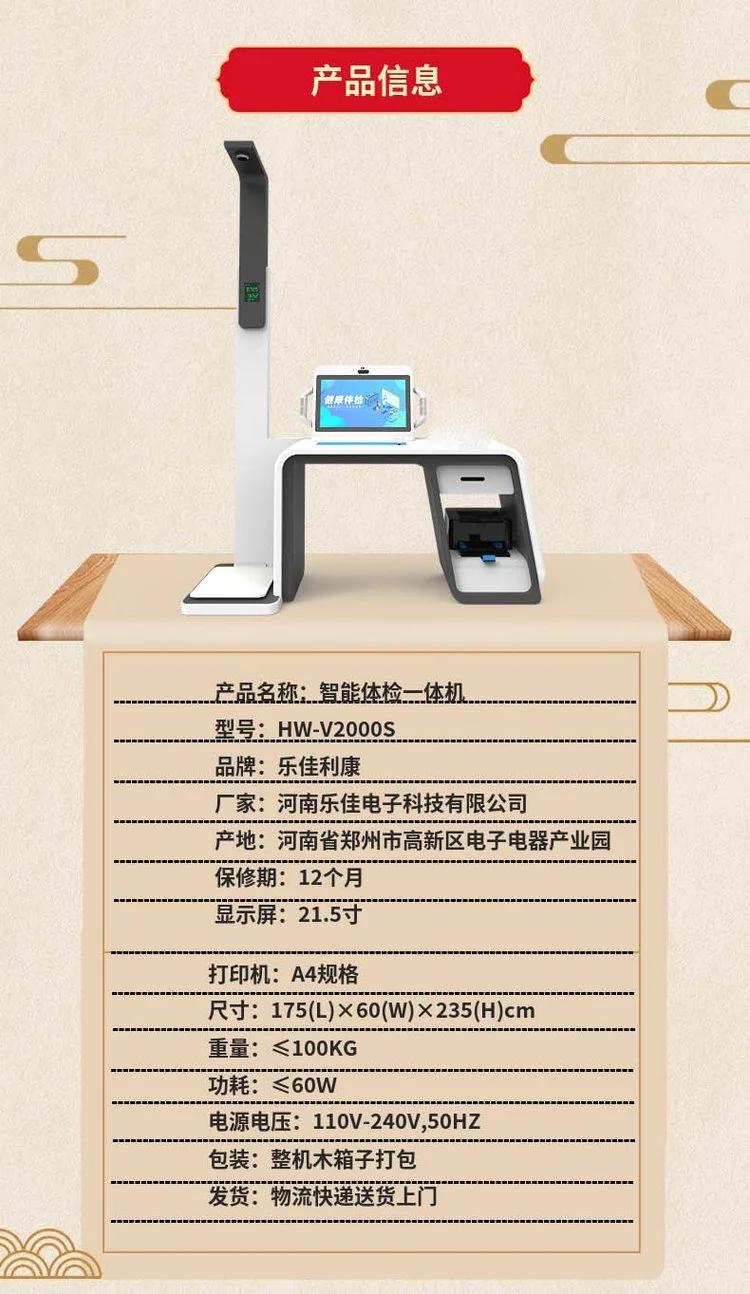 多参数检测:乐佳利康HW-V2000S能够检测多项健康指标,包括但不限于身高、体重、BMI、人体成分、血压、心率、血氧饱和度、体温等。此外,还支持选配心电监测、肺功能、动脉硬化分析等项目,满足用户多样化的健康检测需求。
