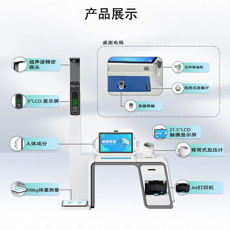 高精度传感器:设备内置高精度传感器,如超声波测高、精密压力传感技术等,确保检测结果的准确性。例如,身高体重测量误差≤0.1cm/kg,血压检测基于欧姆龙臂式方案,结果可靠。