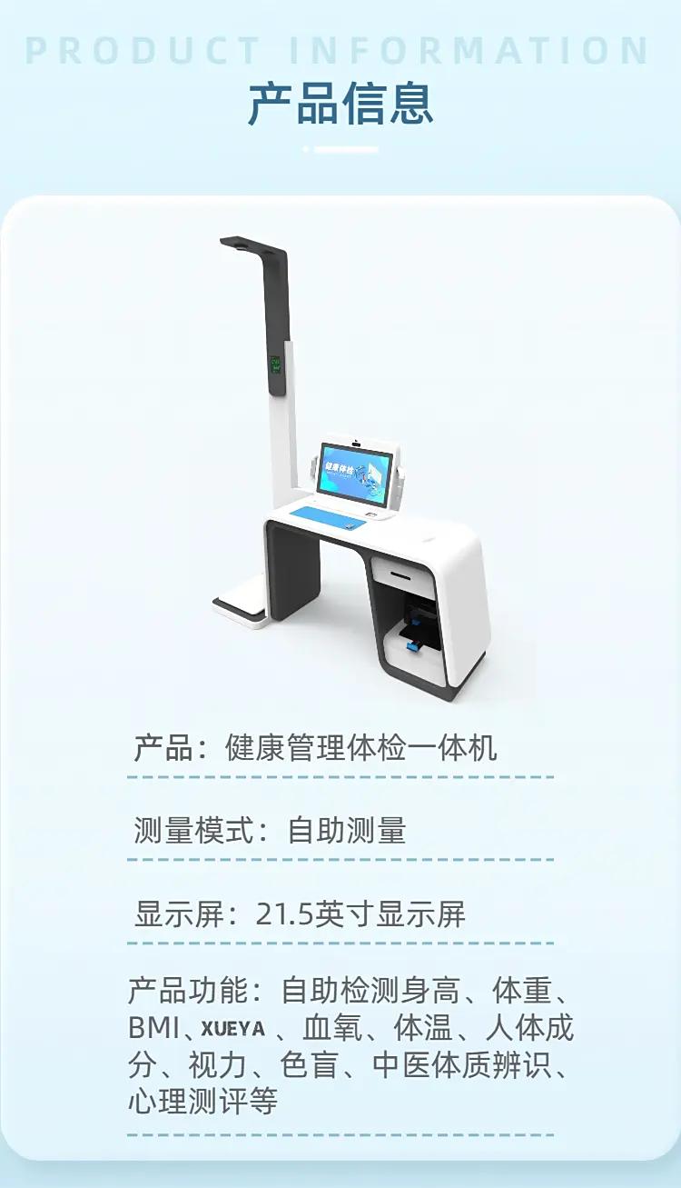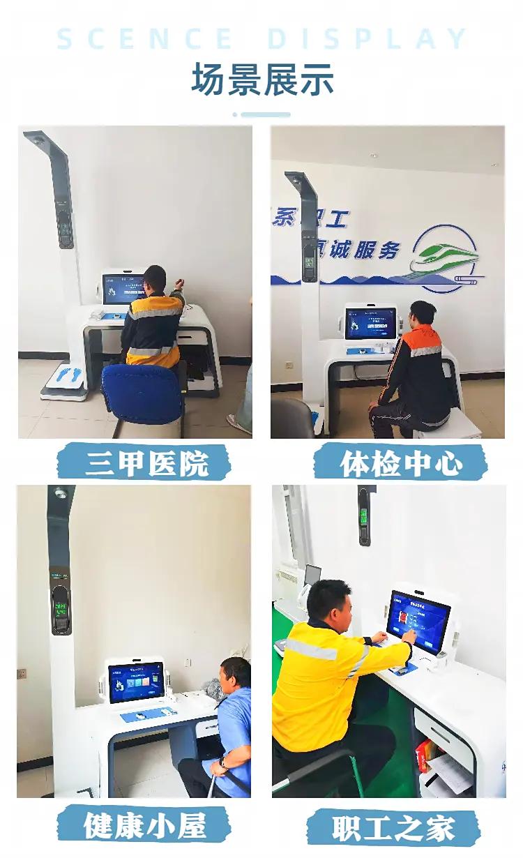 功能集成度:集成了身高体重秤、体脂秤、血压计、、中医体质辨识仪等多种设备功能,单次检测成本低。