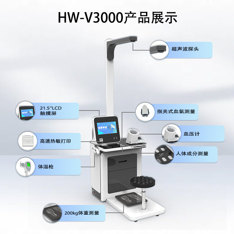 设备采用一体化设计,具备二代证识别、触控屏人机交互、智能系统控制、健康信息管理等功能。