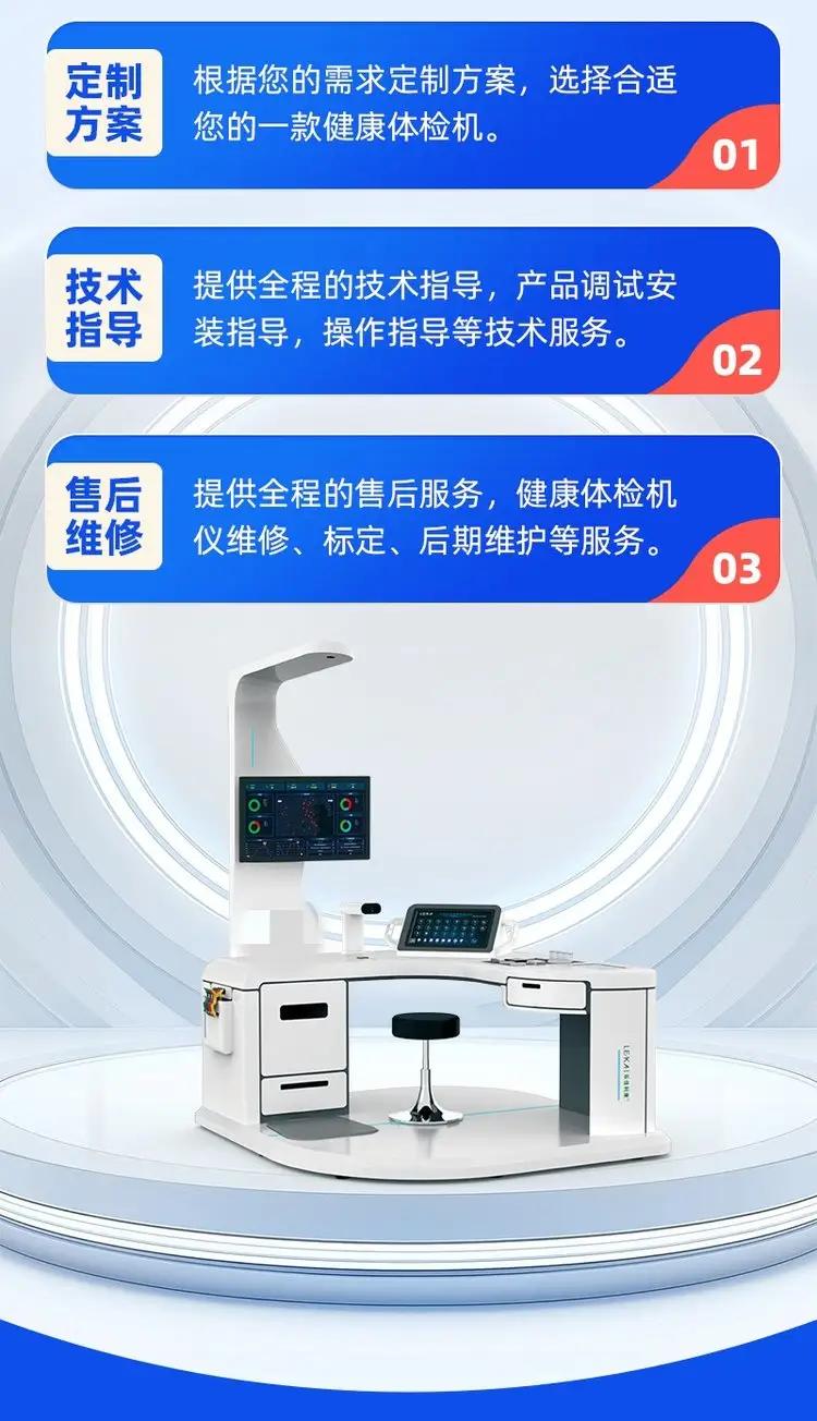 三屏协同设计:配备32寸高清触控主屏、操作副屏及语音导航系统,引导用户自主完成体检流程,老年人亦可轻松操作。