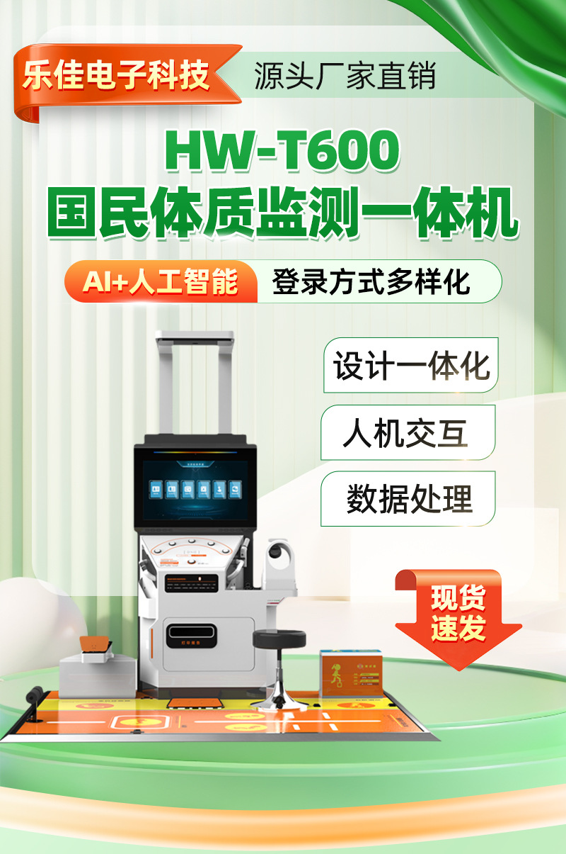 HW-T600体适能测试一体机是乐佳利康品牌推出的一款国民体质健康检测设备,专为全民健身、体育体检等场景设计。该设备集成了多项体检功能,能够快速、准确地测量人体多项生理指标,为用户提供全面的体质评估报告。