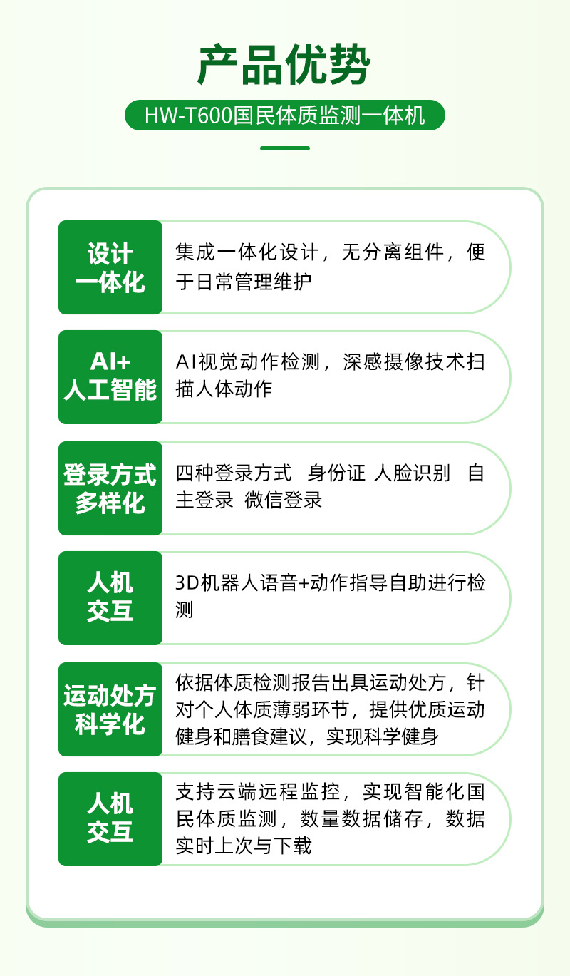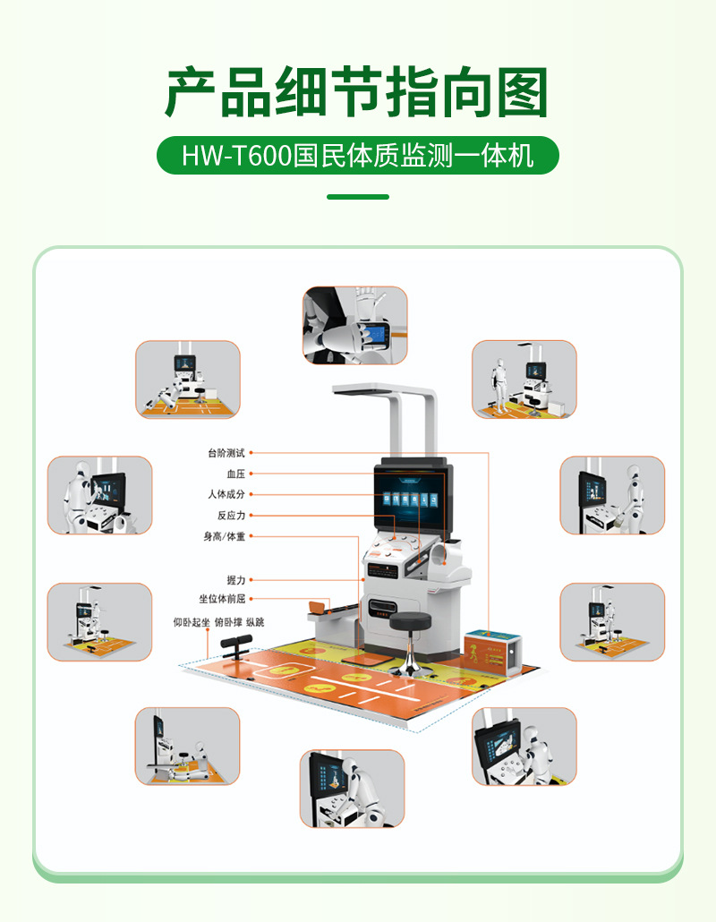 体适能检测仪智能体测一体机HW-T600具备全面检测、智能交互、高精度数据、云端管理、个性化方案输出等核心优势,适用于全民健身、学校体育、企业健康管理、医疗康复等多个场景,是科学化健康管理的设备。 以下是对HW-T600体适能测试一体机的详细介绍: