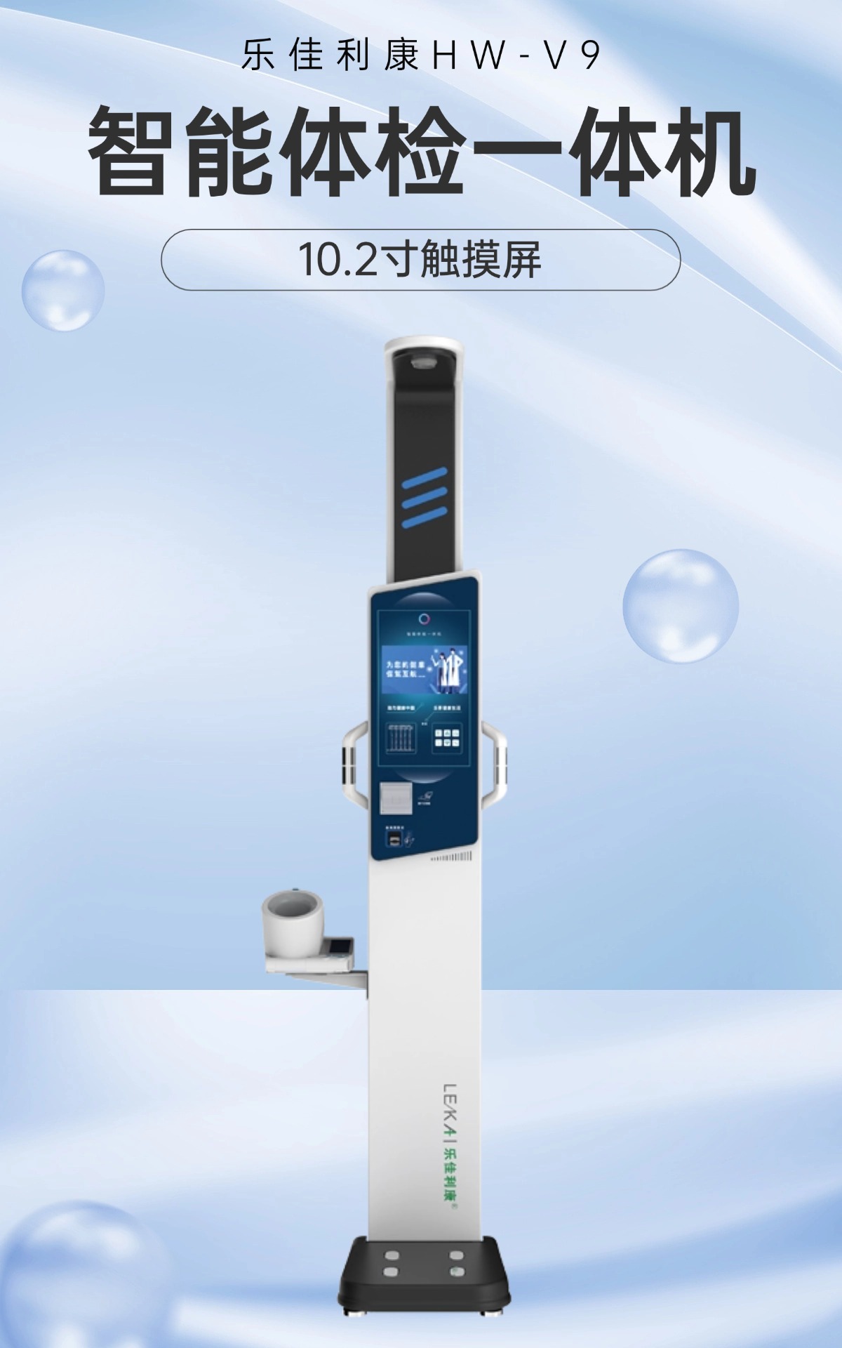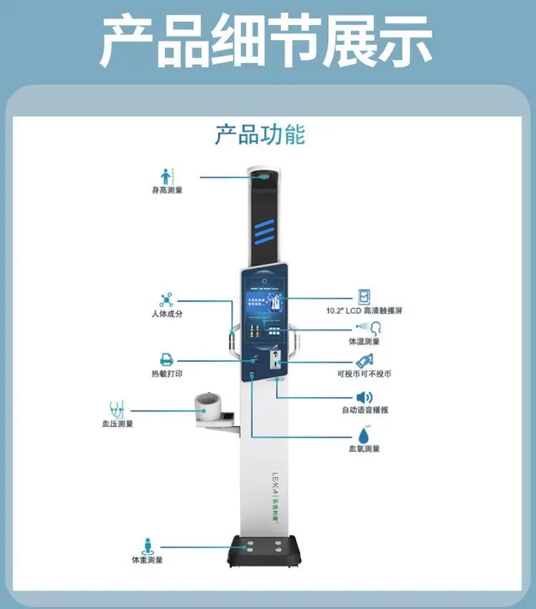 多参数检测:乐佳利康HW-V9体检一体机集成了身高、体重、BMI、人体成分分析、血压、血氧、体温等多项检测功能,能够全面评估用户的健康状况。