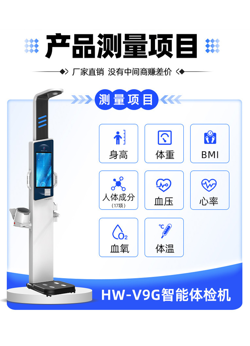 HW-V91集成身高、体重、血压、心率、血氧、体温、人体成分(17项)、中医体质辨识、视力色盲检测等多项功能,覆盖基础生理指标与深度健康分析。