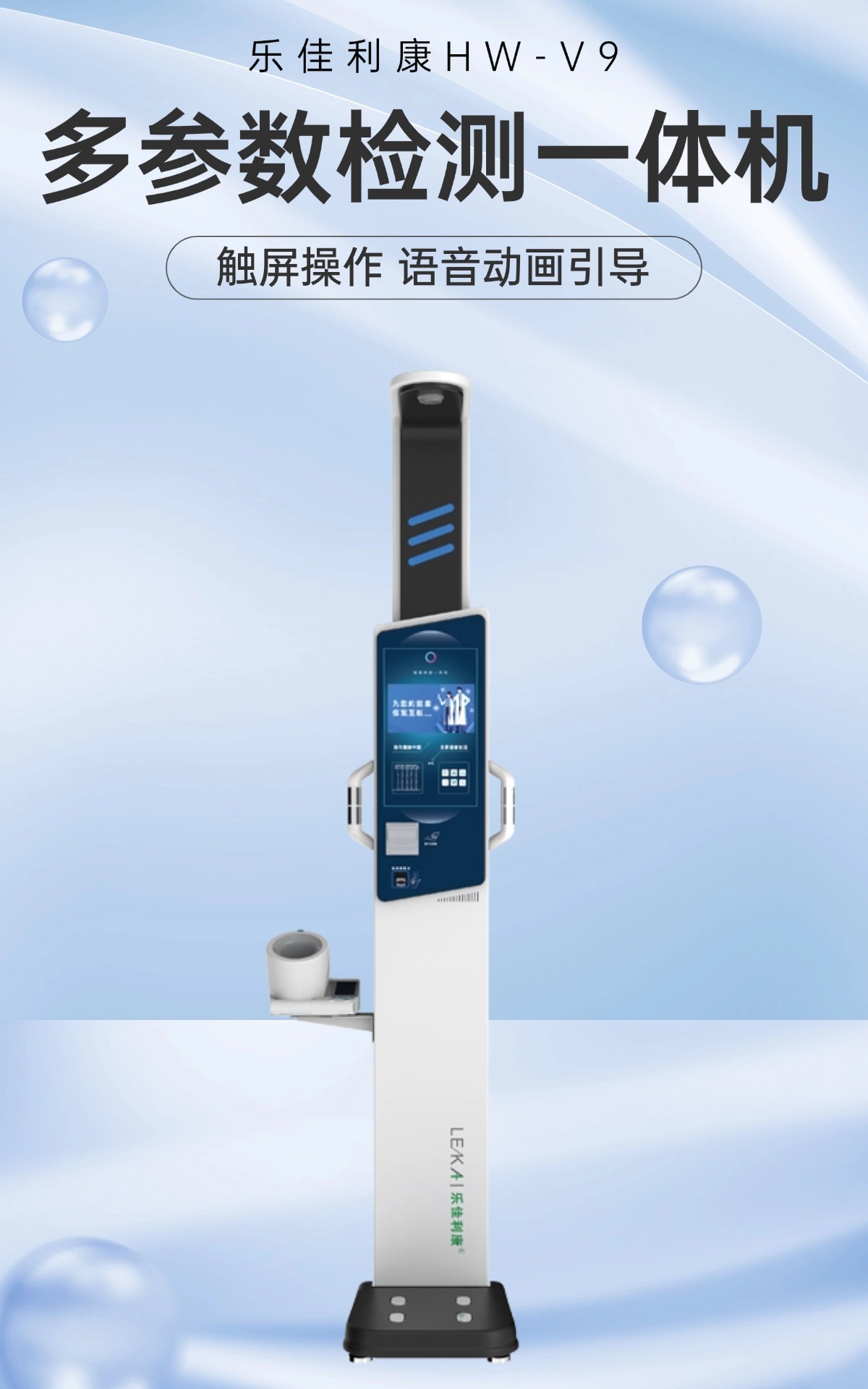 便携设计:整机净重45KG,顶部内嵌炫彩灯带,底盘稳重无棱角,臂筒式血压计可旋转调节,适应不同身高用户。