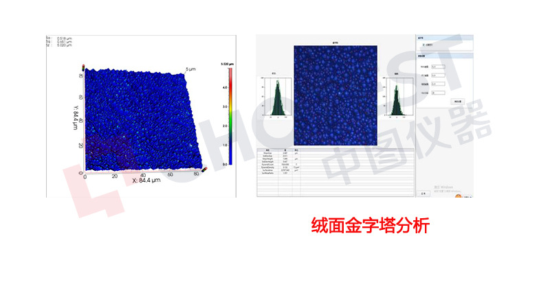 此外,太阳能电池制作过程中,制绒作为关键核心工艺,金字塔结构的质量影响减反射陷光效果,是光电转换效率的重要决定因素。共聚焦显微镜具有纳米级别的纵向分辨能力,能够对电池板绒面这种表面反射率低且形貌复杂的样品进行三维形貌重建,并由专用分析模块自动获取绒面上每个金字塔的体积,比表面积等信息,计算出单位面积金字塔数量和不同尺寸金字塔的比例。
